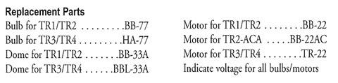 Shopping Cart (0) Quotes (0) All Categories > Revolving Warning Lights > TR Series > Item # TR2-24X All CategoriesAll Categories Revolving Warning LightsRevolving Warning Lights TR SeriesTR Series Item # TR2-24X Item # TR2-24X, Revolving Lights - TR Series TR2-24XRevolving Lights - TR Series Request Information Email This Page Download PDF Download PDF Printable Page List Price $122.50 Qty. Add To Cart Request Quote Downloads INSTALLATION AND OPERATING INSTRUCTIONS - TR2 - TR3 /Asset/TR2-A.jpg /Asset/TR2-A.jpg Close Window The TR2-24X is a low-cost revolving light which combines a bright incandescent lamp with a polished reflector. Unit of Measure Imperial Metric Both Specifications Mounting N/A Permanent Mount Voltage N/A 24 Volts Flashes per Minute (FPM) N/A 135 SF UL Listed N/A No Height N/A 5.25 in Light Output N/A 6600 candelas/second Rated Current N/A 1.1 Amperes Series N/A TR Bulb Part # N/A TR-24V77*
